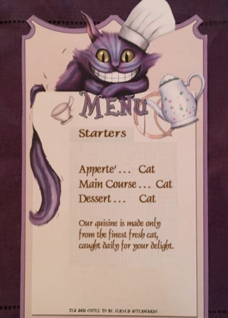 So anyway, be sure dat Cafe De La Critter is a fine dining experience and dat no Virtual Aminuls is harmed in our presentations. As our dishes is totally meat, we also harm no trees, vegetations or other food products in our meals. We use only fine, Dwagon-inspected grade-A actual cat in our recipies-- and as dey usually found flat and runned over at side of road, we is not responsible for dere untimely demise.